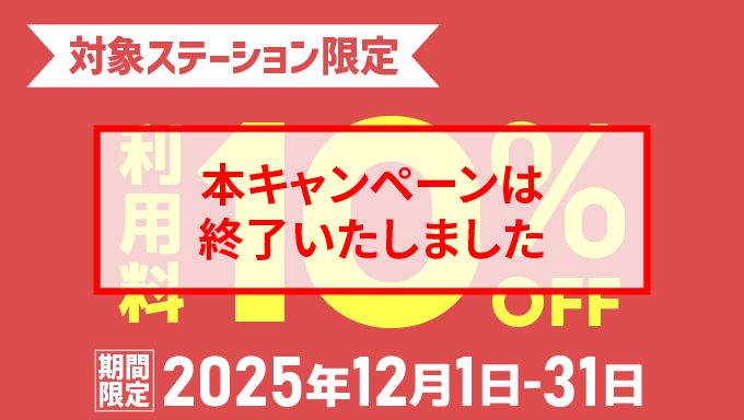 | 特典内容 | 対象ステーションの車両に限り、利用料(時間料金 または パック料金)10%OFF |
