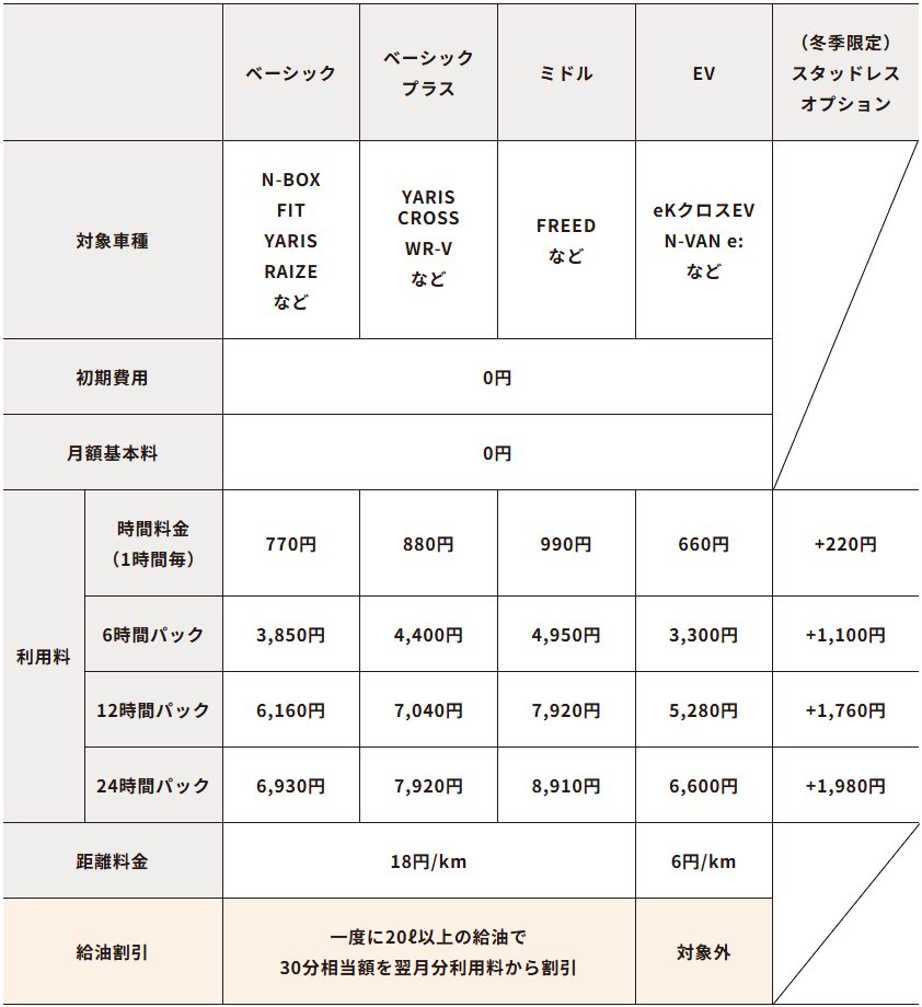 - ・スタッドレス料金を「時間料金:通常利用料+220円」、「6時間パック:通常利用料+1,100円」、「12時間パック:通常利用料+1,760円」、「24時間パック:通常利用料+1,980円」に変更(改定前:一律「通常利用料×1.4」)。通常料金との差がこれまでより少額となります。