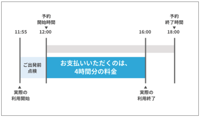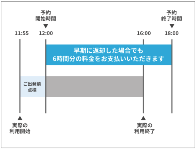 予約開始時間(予約時または予約変更時に指定した利用開始時間)から予約終了時間(予約時または予約変更‧延⻑時に指定した利用終了時間)(※)までが利用料の課金対象となり、利用料をご請求いたします。予定より早い時間でのご返却の場合でも、予約時間での課金となりますのでご注意ください。予約終了時間以降に返却された場合、別途超過料金が発生します。