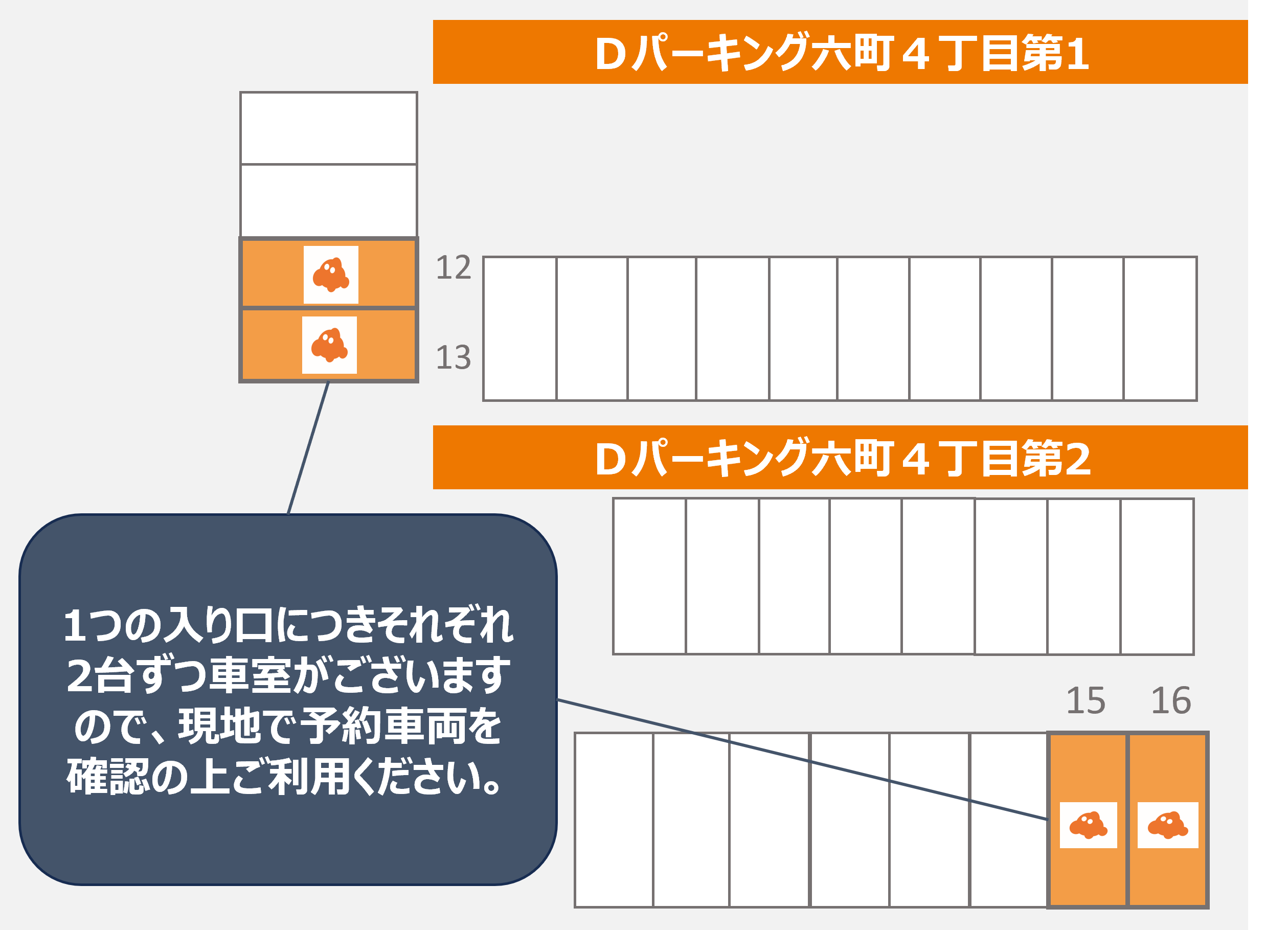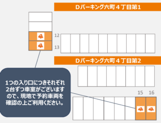 1つの入り口につきそれぞれ2台ずつ車室がございますので、現地で予約車両を確認の上ご利用ください。