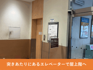 船堀駅からー番近い北側の入口から入り、右手にあるサーティーワンを過ぎて左に曲がった先にあるエレベーターで屋上階へ上がります。