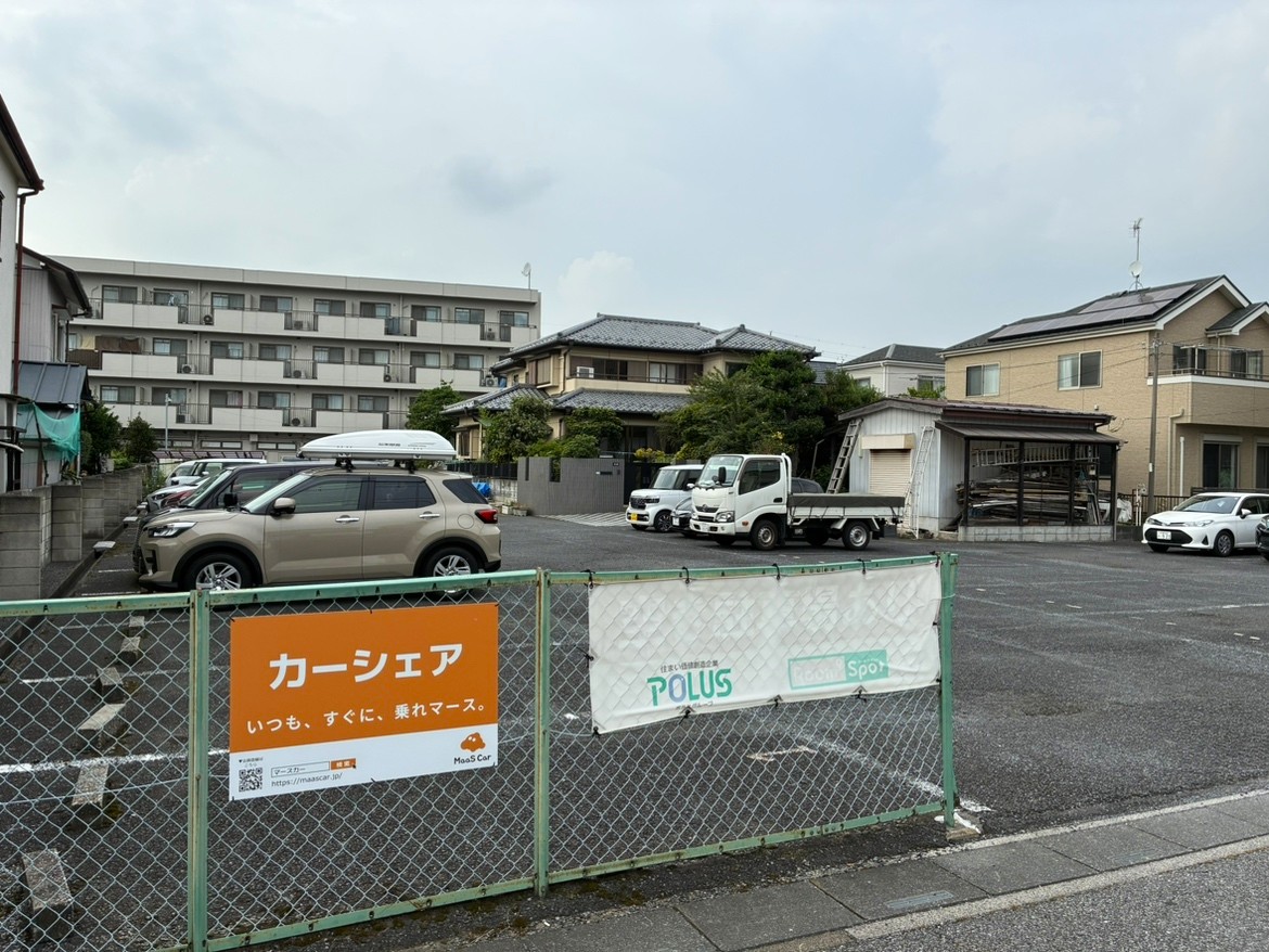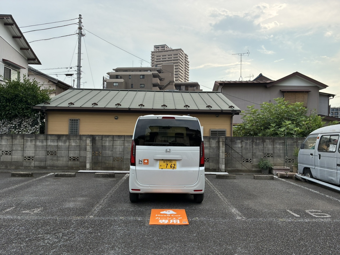 (MaaS Carの車枠であることを示す表示板側に車両の後輪、車止めが設置されている場合は車止めに車の前輪が触れるように駐車してください。)