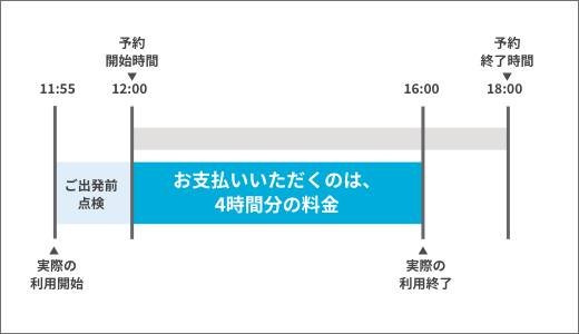 予約開始時間(予約時または予約変更時に指定した利用開始時間)から予約終了時間(予約時または予約変更‧延⻑時に指定した利用終了時間)(※)までが利用料の課金対象となり、利用料をご請求いたします。予定より早い時間でのご返却の場合でも、予約時間での課金となりますのでご注意ください。予約終了時間以降に返却された場合、別途超過料金が発生します。